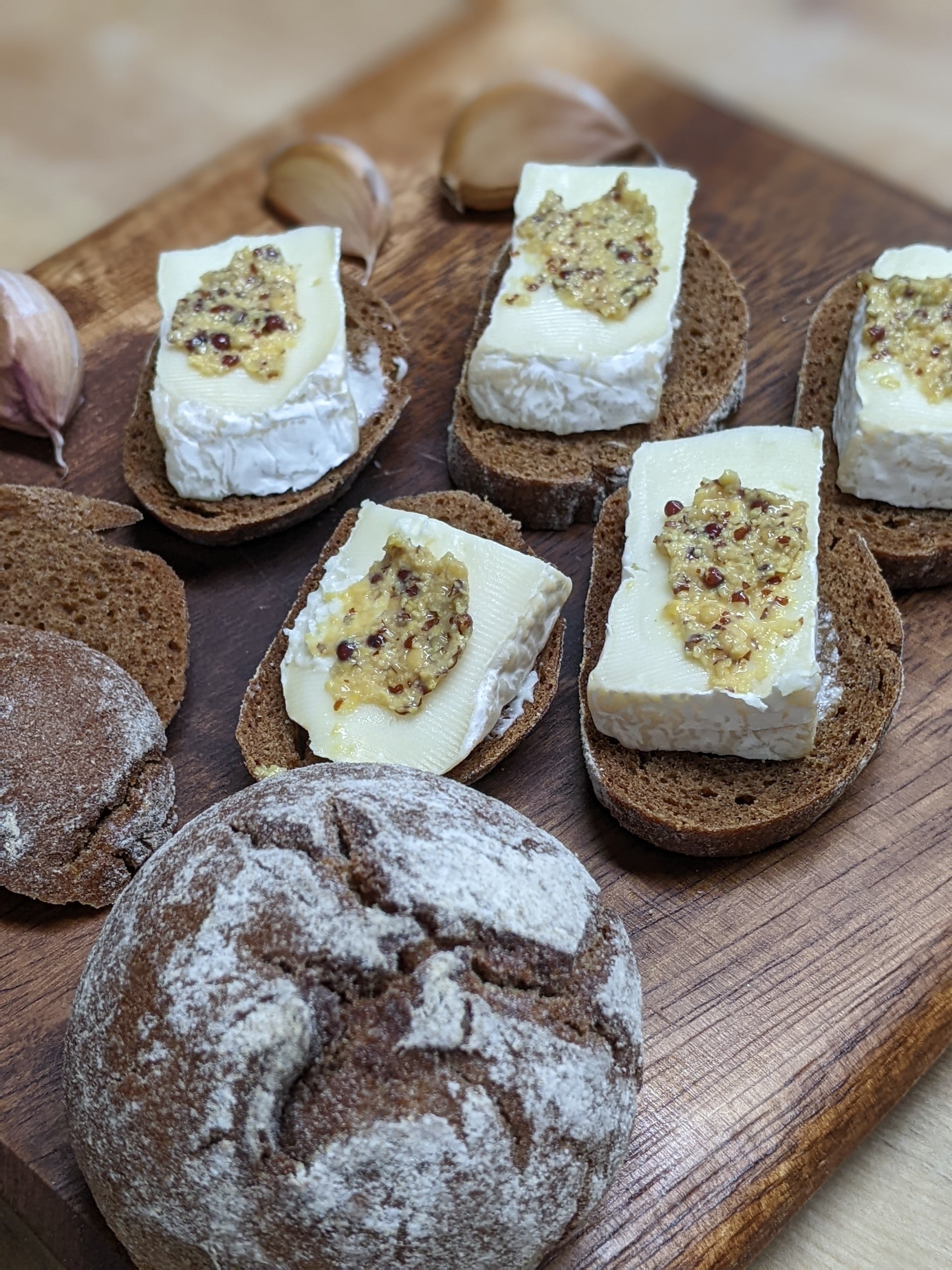 召し上がる前に軽くトーストすると、種子の油分が活性化し、バターを塗らなくても十分なほど濃厚なコクが生まれます。ヒューゲルではチーズ+マリネの組み合わせに夢中です!